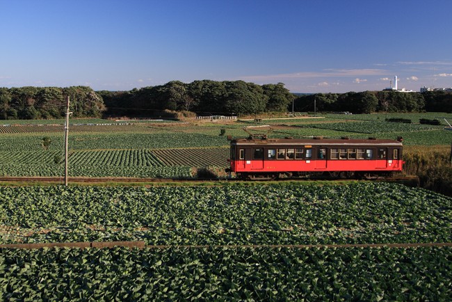 日の出を撮影した公園から歩いて10分、銚子電鉄の線路があります。快晴のもと、収穫待ちの冬キャベツ畑の中を、銚電カラーンのデハ801軽快に走ります。