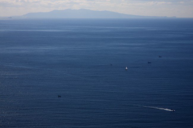静かな冬の海。前方に見えるのは伊豆大島ですね。
