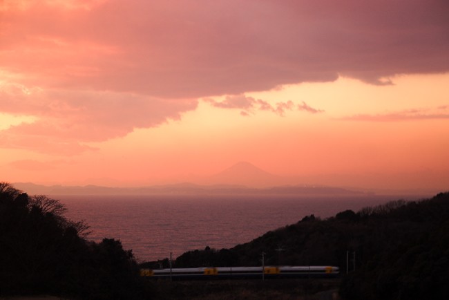 水平線はやや雲ががありましたが、ぽっかりと富士のシルエットが。ちょうど夕焼ピークのタイミングで、上りのさざなみ。