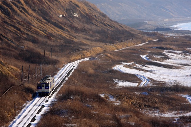 雪はあまり降らない日高地方。春にも撮った場所ですが、冬らしく白い線路が嬉しいですね。8:59下り苫小牧行き。