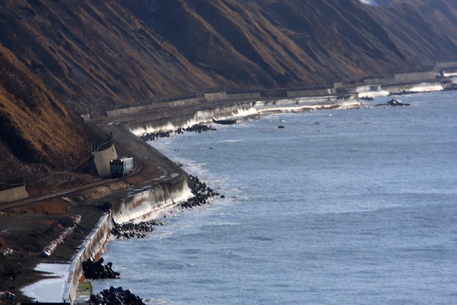 春に見つけた断崖絶壁ポイント。厳しい荒海をイメージしていましたが、春より穏やかな海でした。波に洗われたのか雪はありませんね。