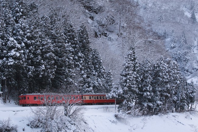 糸魚川方面に上るにつれて、着雪状態が良くなってきました。ここ平岩あたりも素晴らしい雪景色。
