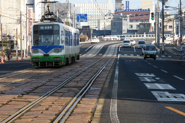 岐阜の頃と同じように、石畳の複線路面。福鉄カラーとなって、すっかり当地の主役になっている様子。