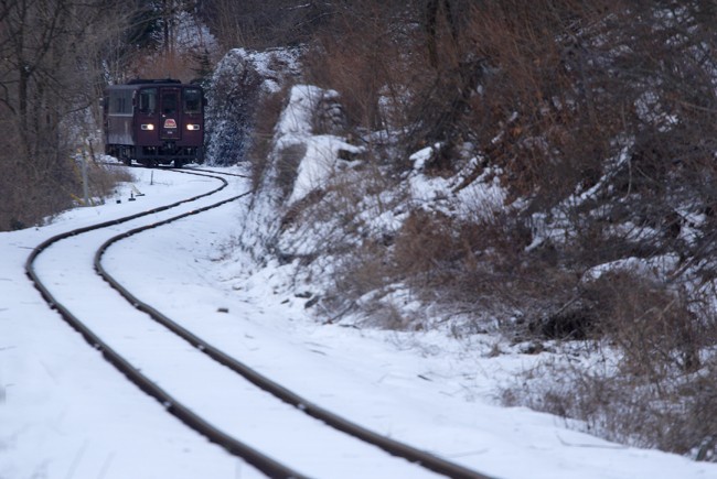 雪景色が、わ鉄名物?!くねくね線路を引き立たせます。