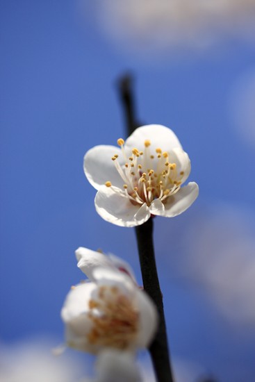 駅近辺に、白梅の木が数本。ちょうど見頃の梅を青空バックに。