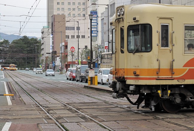 いよてつでは、訪ねたかった場所の一つ、大手町踏切。この踏み切りは、郊外線(高浜線)と路面電車が「平面交差」する場所として鉄道ファンの間では有名です(日本でここだけ)。 交差部分は、ガタガタ音をたて、スパークさせながら走ります。