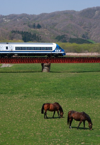 バックの山はまだ冬景色。ようやく緑が芽吹き始めた北の大地。馬がのんびりと草を食む春の午後。いいなぁ。