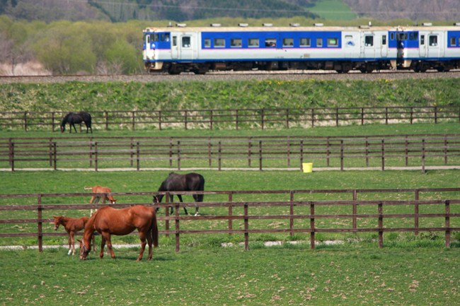 3月〜5月はサラブレッドの出産シーズン。母馬に寄り添う仔馬が見られます。単行を想定して構えていたら、嗚呼、2両編成。