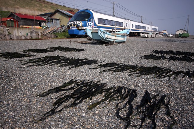 昆布乾しの浜を行くリゾート列車。なんだかちょっとミスマッチかも‥。