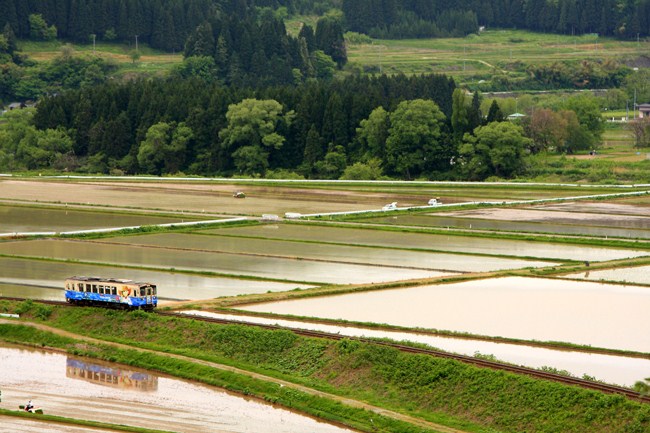 終点矢島に向け、築堤を登る列車。水が入った田圃と沿線の緑がとても美しく、目に優しい光景でした。