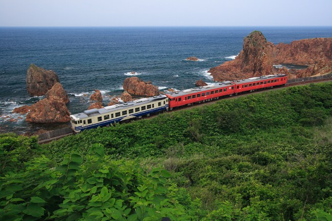 深浦の町はずれの赤岩のポイント。初夏らしく緑多いですね。そして、もうすぐ私のお目当て行合崎。