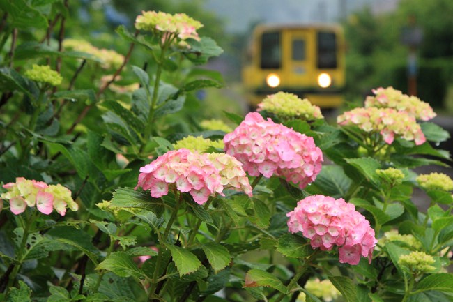 上総中野で、いすみ鉄道に乗り継いで、紫陽花の駅「小谷松」で下車。ここも五分以上の開花状況で、色とりどり。