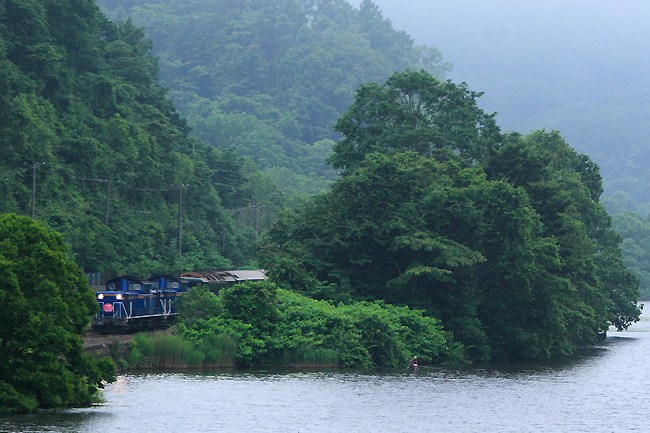 下りトワイライトエクスプレスが定時に通過。緑の合間に一瞬顔を出すDD51重連機関車。「湖面にさざ波」が少し残念ですが、初夏らしいシーンが撮れました。