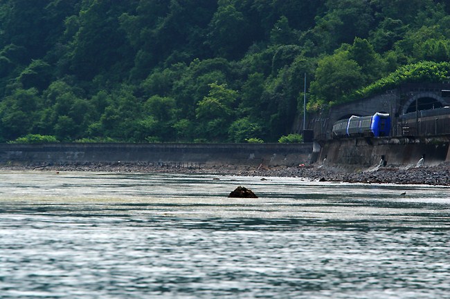 「まさに海沿い」を、ハイスピードで通過するスーパー北斗