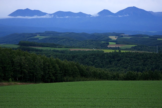 帰りのフライトまで少し時間があったので、丘に立ち寄りました。薄曇りでしたが、十勝の山々はくっきり。カラ松を含めて、一面緑の夏の丘です。