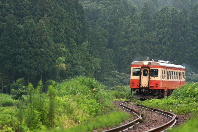 高温多湿の大野の森。奇麗なS字を国鉄色単行が登ってきます。