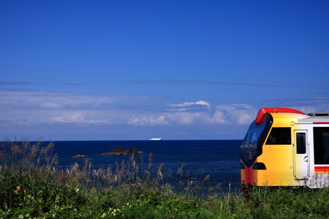 五能線を象徴する驫木、風合瀬あたり。再びこの地に立てて幸せだなぁ。青い風景に、リゾート三兄弟の中で最も派手な「くまげら」、目立ちます。