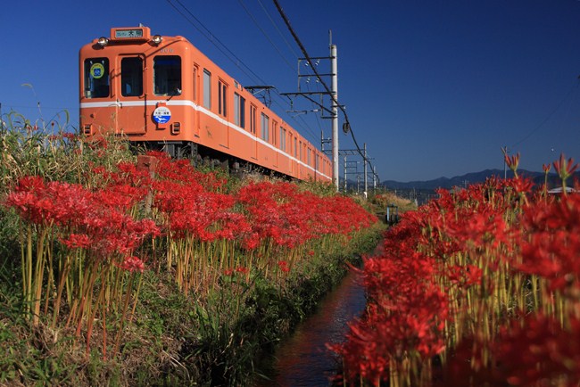 快晴の朝。 樽見の犀川堤か、久々の養老か迷った末、ラビットカー復活の養老鉄道へ。車窓から赤が目立った美濃本郷で下車。正解でした。空も花も、そして列車も、いい色です。