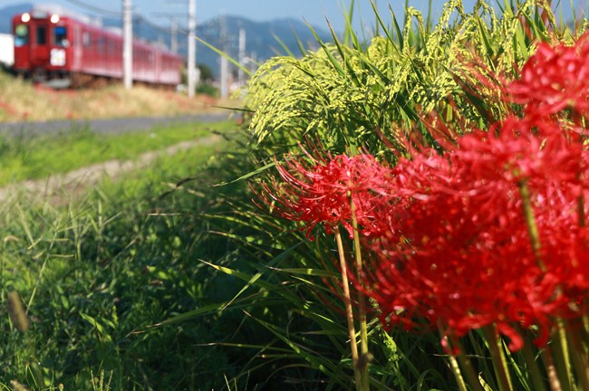 稲はまだ収穫前。彼岸花の赤とも、マルーンの列車とも相性よしです。