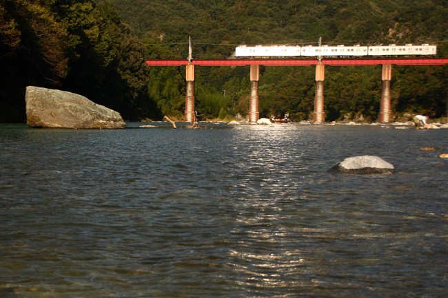 ステンレス車両のギラリで、川面もギラギラ。