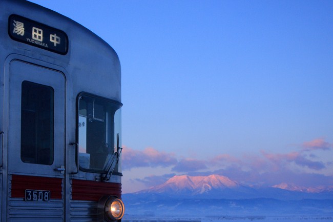 始発列車で湯田中へ向かいました。桜沢で下車すると、ちょうど戸隠の頂に朝日が当たりました。空はまだ夜明けの色