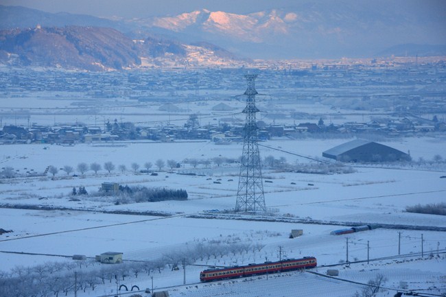 ツルツルの坂道を登ると身体が温まりました。フリーズした感じの善光寺平、リンゴ特急参上です。