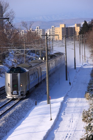 駅近くの跨線橋からお手軽撮影。旭川行き始発のスーパーカムイ。雪煙りあげて、早春でも北海道の雪質はパウダーです。