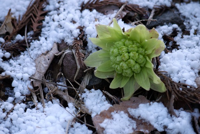 線路端には雪の間からふきのとう(当地では「バンケ」といいます)。
