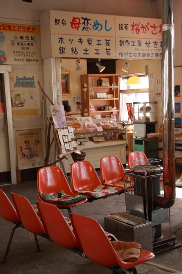 改札は無人ですが、待合室にはストーブ。 売店もあります。「母恋めし(駅弁)」も販売しています。