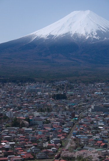 富士山、富士吉田の町、そして富士山方面に線路。雄大な光景ですが、標準レンズで十分届く距離なのがスゴイ。