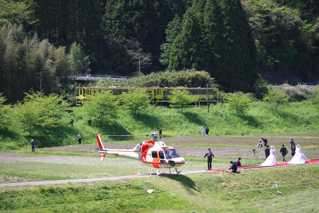 ヘリに乗って蓮華畑に花嫁到着。ちょうど列車が通りかかる。まとまりはないけれど微笑ましい光景でした。