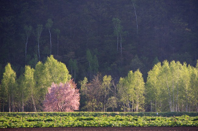 新緑の中に桜を見つけ、車を止める。美しい朝が続きます。