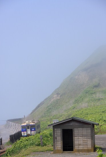 お昼少し前に、大狩部。快晴ですが霧が出ています。