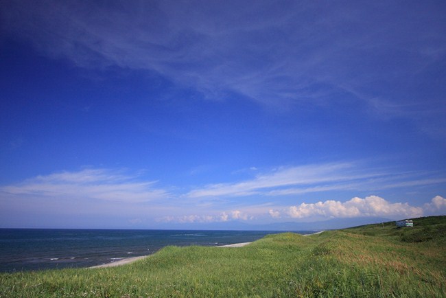 今度は1時間ほどの待ち時間がありました。背丈の半分くらいまで伸びた夏草をかきわけながらあちこち歩いて、ここがいいかなと三脚を立てる。海も入れたい空も入れたい夏草の海岸も入れたいと欲張り広角。