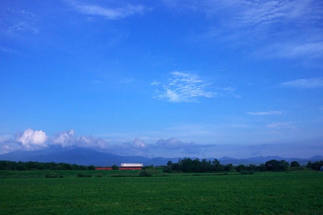 同じ列車が、海別岳バックの鉄橋を通過。味わいあるシーンが撮れました♪ 夕焼けは期待できませんが、初日これだけ青空が撮れれば大満足。