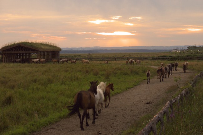 放牧された馬たちも厩舎に帰る夕暮れ時。