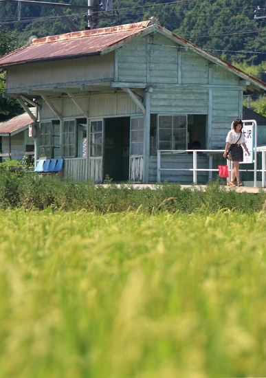 色づき始めた青田の向こうに八木沢駅