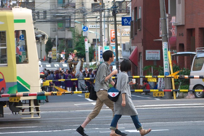 神輿が近づく坂の途中の踏切。
