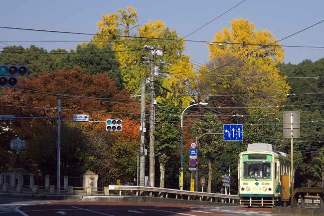 音無親水公園の木々が色づいて、カラフルな併用軌道。交通量多く、このようにすっきり撮れるのは5回に1回