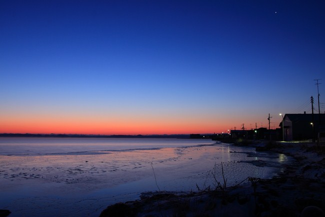 翌朝、花咲線に向かう途中の厚岸湾。夜が明けました。空には明けの明星。マイナス17度の色温度です。