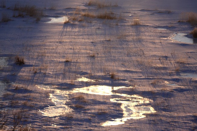 そして、約10年前の真夏以来の別寒辺牛湿原。念願の再訪です。朝日が凍った湿原に当たります。