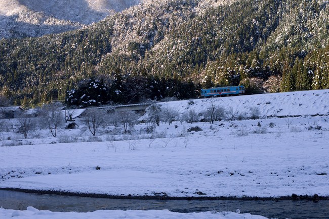 新雪で美しい山間です。列車通過時に日が入らなかったのが残念