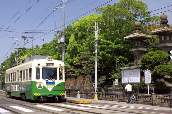 住吉大社前です。いい新緑です。阪堺電車って、新緑と同系色が多いですね。