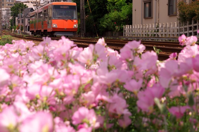 所用を終えて、世田谷線。いつも花で溢れる松原界隈。5月はヒルサキツキミソウでした。