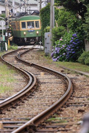 極楽寺から稲村ヶ崎にかけては小さな路地を巡りながら、線路の曲線美とワンポイント紫陽花。