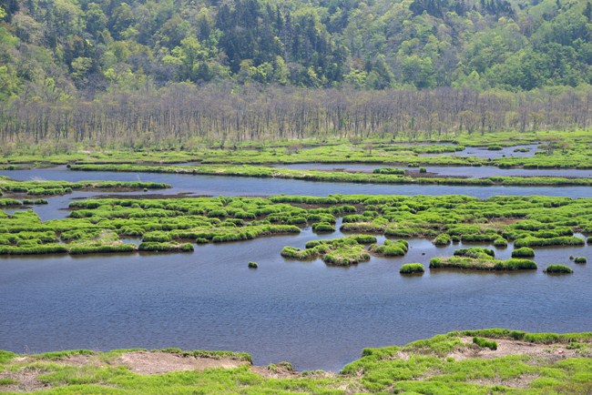 次の列車通過が待ち遠しい、淡い緑の湿原です。