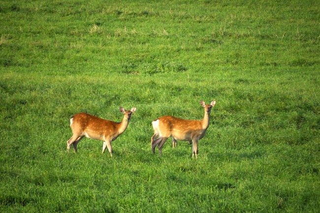 「夕陽は海で」と音別に向かう途中、鹿の群れ。目が合いました。