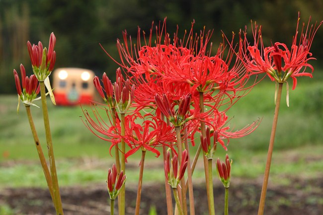 猛暑のせいか、開花が遅れているようで、赤い花はまだチラホラの養老渓谷付近