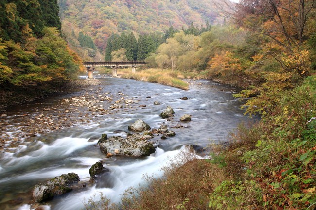 翌日は薄日差す朝。渓流に紅葉と素敵なロケーションでした。列車通過30分前から三脚セットして構図を決めて準備万端。しかし、肝心の列車通過時にぼやっとして痛恨の撮り逃し(嗚呼)。