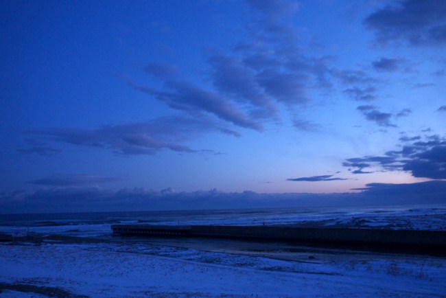 日の出時刻(7時頃)に通過する列車を狙おうと、オホーツク海、知床半島を望めるポイントへ。雲多いけど、晴れてます。気温はマイナス二桁で、ダルマのように着込んでいます。